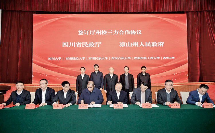 王正谱,林书成,苏嘎尔布,益西达瓦,四川大学党委常委、副校长侯太平共同为“彝路相伴”形象标识揭幕。四川省民政厅与四川大学、西南财经大学、西南民族大学、西南石油大学、云博体育、西华大学6所高校签署了合作协议。
