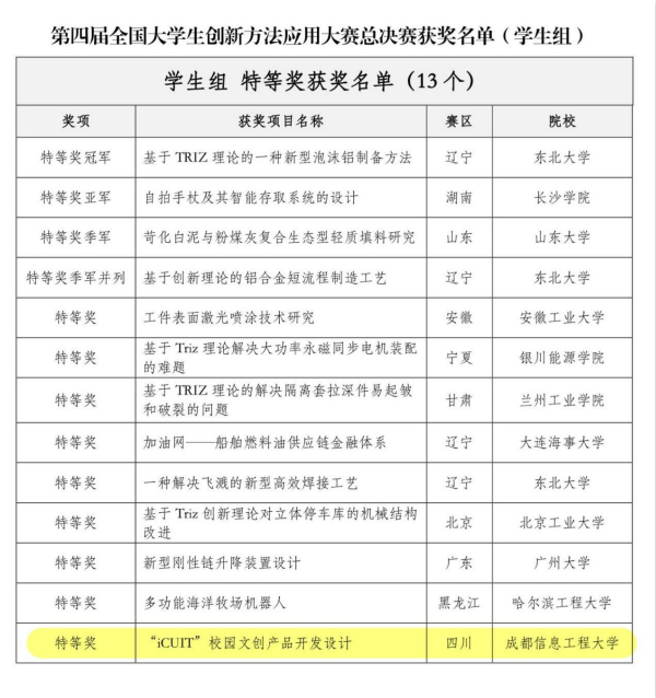 第四届全国大学生创新方法应用大赛总决赛”特等奖”获奖名单