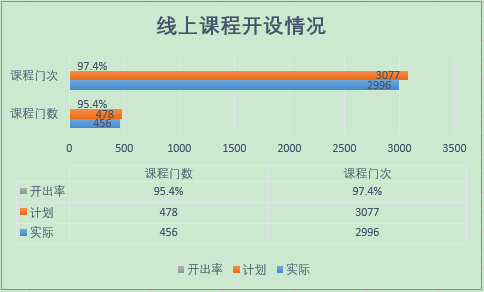 线上教学运行平稳。开课一周来,学校691位教师开展了线上教学(占总排课教师的80.2%),共开设本科线上课程456门/2996门次(线上开出率达95.4%),教学面覆盖451个学生行政班级,学生在线学习累计达180029人次。