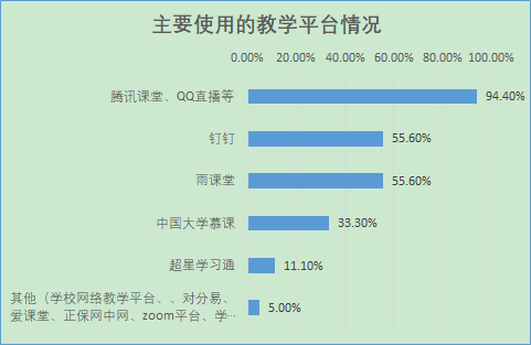 线上教学手段丰富多样。各学院积极组织线上教学平台、软件使用培训,让师生掌握平台、软件使用技巧和方法。为保障在线教学顺利实施,针对可能出现的网络拥堵情况,师生们在确定了一个在线教学主平台的基础上,又准备了1个以上备用授课方案,并在所选平台提前进行测试和预演。根据各学院教师使用前5位的教学平台反馈数据,腾讯课堂、QQ直播、钉钉、雨课堂、中国大学慕课等平台使用教师较多。