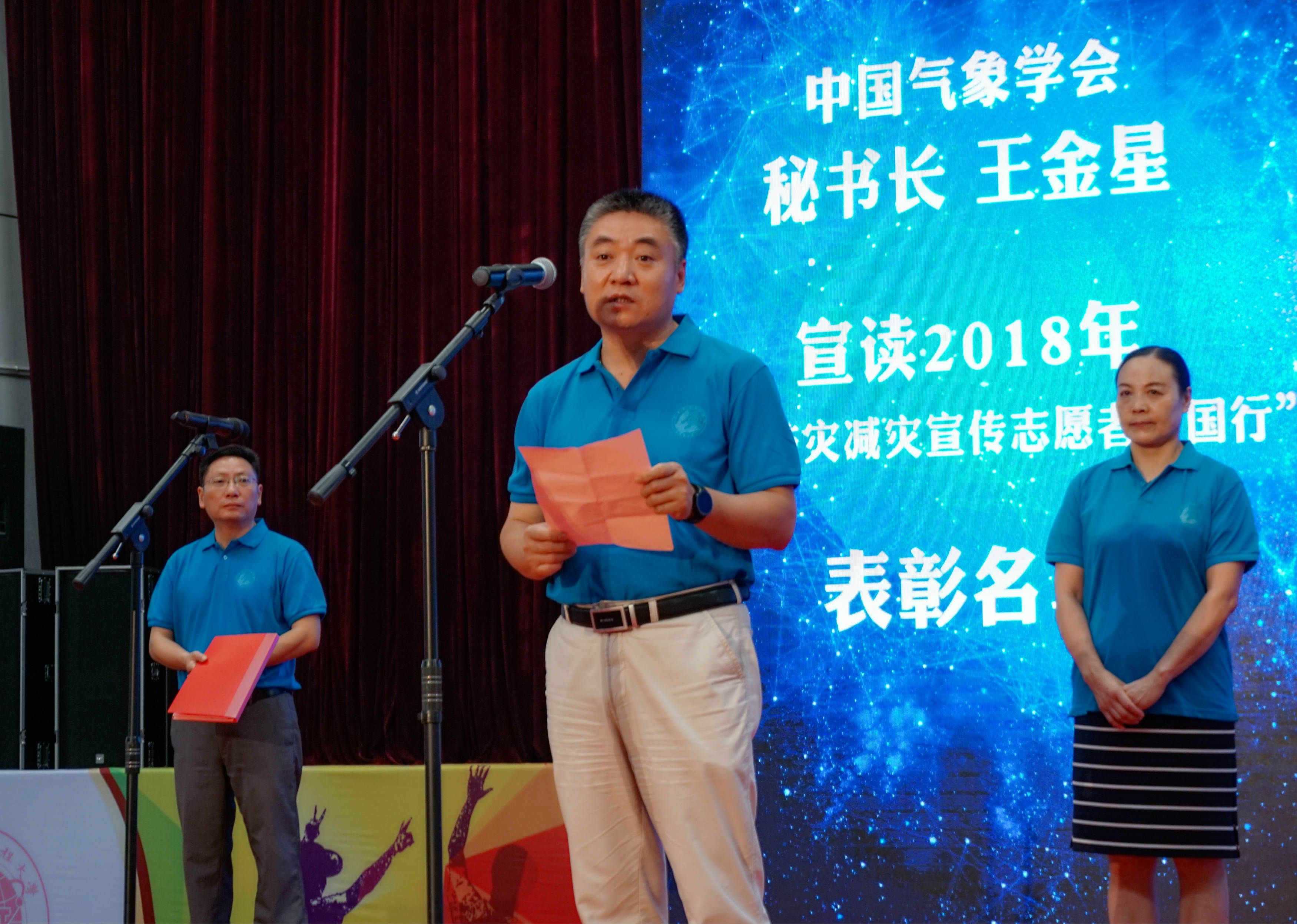 王金星宣读了2018年“气象防灾减灾宣传志愿者中国行”活动评优表彰名单。云博体育—成都A队、东北农业大学—中国气象行团队、四川农业大学—将计就计团队、兰州大学—中国气象防灾减灾科普宣传队重庆分队等分别获得2018年“气象防灾减灾宣传志愿者中国行”活动最佳报告奖、最佳文字记录奖、最佳影像记录奖、最佳创意奖和一二三等奖团队等奖项。云博体育、南京信息工程大学、兰州大学、东北农业大学、四川农业大学获得优秀组织单位荣誉。参会领导为获奖团队和优秀组织单位颁奖。