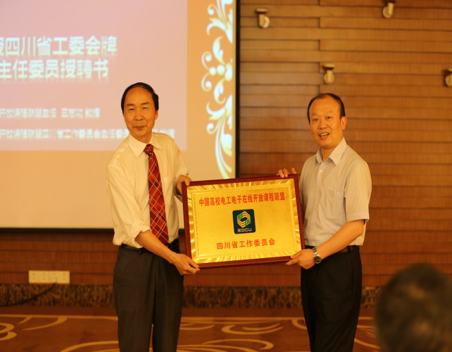 我校被推荐为“中国高校电工电子在线开放课程联盟四川省工作委员会”主任单位,王志功教授为我校授主任单位牌;EOCU四川省工作委员会秘书处挂靠我校教务处,执行秘书处为高等教育出版社四川省教学服务中心。
