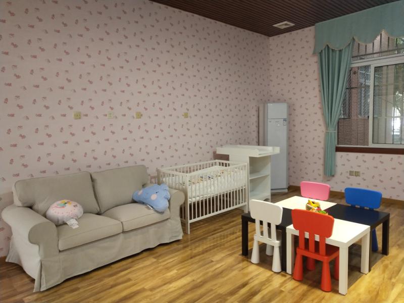 “妈咪宝贝屋”位于航空港校区第二教学楼一层(原咖啡吧),空间宽敞、明亮、温馨、舒适。从进门开始的指纹密码锁到置物台上的小玩具,无不体现出用心和贴心。室内设施功能齐全,内设哺乳区、护理区、冲奶区、休息区等多功能性分区。哺乳区配备有桌椅、沙发;护理区配置有尿布替换台、垃圾箱、置物桌、洗手台;冲奶区配置有电水壶、冰箱、收纳柜;休息区配置有婴儿床、换气扇、空调、绿植等设施。“妈咪宝贝屋”使用的材料、电器、家具等均绿色环保,并将定期组织专人清洁、消毒。既保护女教师哺乳期间的隐私,又为她们提供了安全、舒适的专门护理场所。