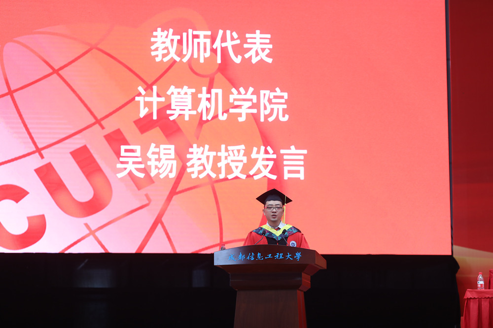 四川省杰出青年学术技术带头人基金获得者吴锡教授作为教师代表发言。他回忆了毕业后来到学校工作,与学校共同进步的经历,分享了他所理解的成信人与众不同的精神品质和出类拔萃的价值追求。他衷心希望毕业生们在未来的人生中,更加自律、自信、自强,以成于大气的努力与坚持以及信达天下的理想与信念,投身到实现中华民族伟大复兴的中国梦中,发出属于自己的时代最强音。