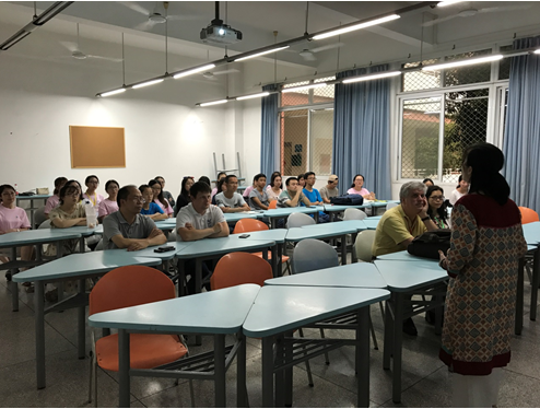 文化艺术学院教师刘洁带领三位外籍专家开展了一场趣味汉语体验活动。刘洁生动有趣的教授了如何用汉语进行“自我介绍”:“你好,我叫……,我是……,我喜欢……”,通过老师风趣幽默地讲解和与中国学生的互动训练,外籍专家们已经能够“字正腔圆”的用汉语简单地作自己介绍。在活动中,刘洁还示范了汉字的书写过程,讲授了美丽而古老的汉字“故事”。