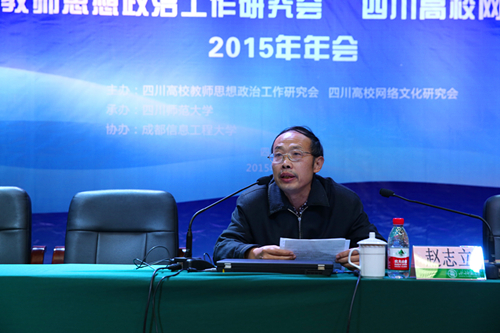 【本网讯】 11月27日,由四川师范大学主办、我校协办的四川高校教师思想政治工作研究会暨四川高校网络文化研究会2015年年会在四川师范大学狮子山校区学术报告厅召开。四川省教育厅宣传思想工作处处长陈小红,四川省社科联规划办主任黄兵,四川师范大学党委副书记唐尚朴,四川高校网络文化研究会会长、我校党委副书记敬枫蓉出席大会。全省86所高校宣传部、相关职能部门的负责人和有关方面的同志共120余人参加会议。我校宣传统战部部长饶华、副部长丁恒康,文化艺术学院教授蓝鹰参会。大会由四川高校教师思想政治工作研究会会长、四川师范大学党委副书记王万民主持。