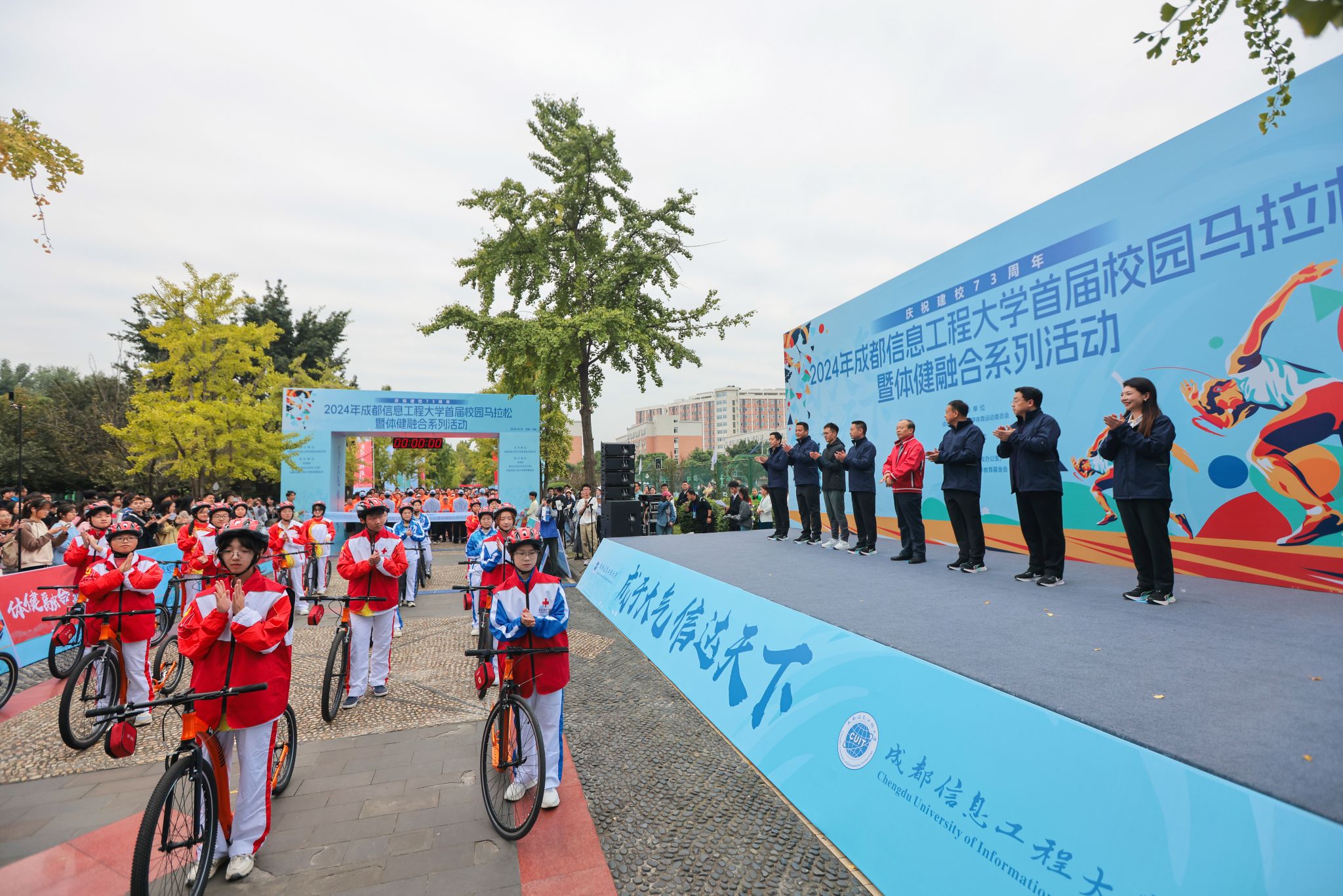 学校校长何建新、副校长陈权亮,体育部党委书记、主任程艺,国内合作处、校友办公室主任张斌兵,学生工作部部长龚晓林,校工会委员会专职副主席周波,校团委书记刘琰琰,学校杰出校友、赛事宣传官碾者阿提参加起跑仪式,为比赛鸣笛。