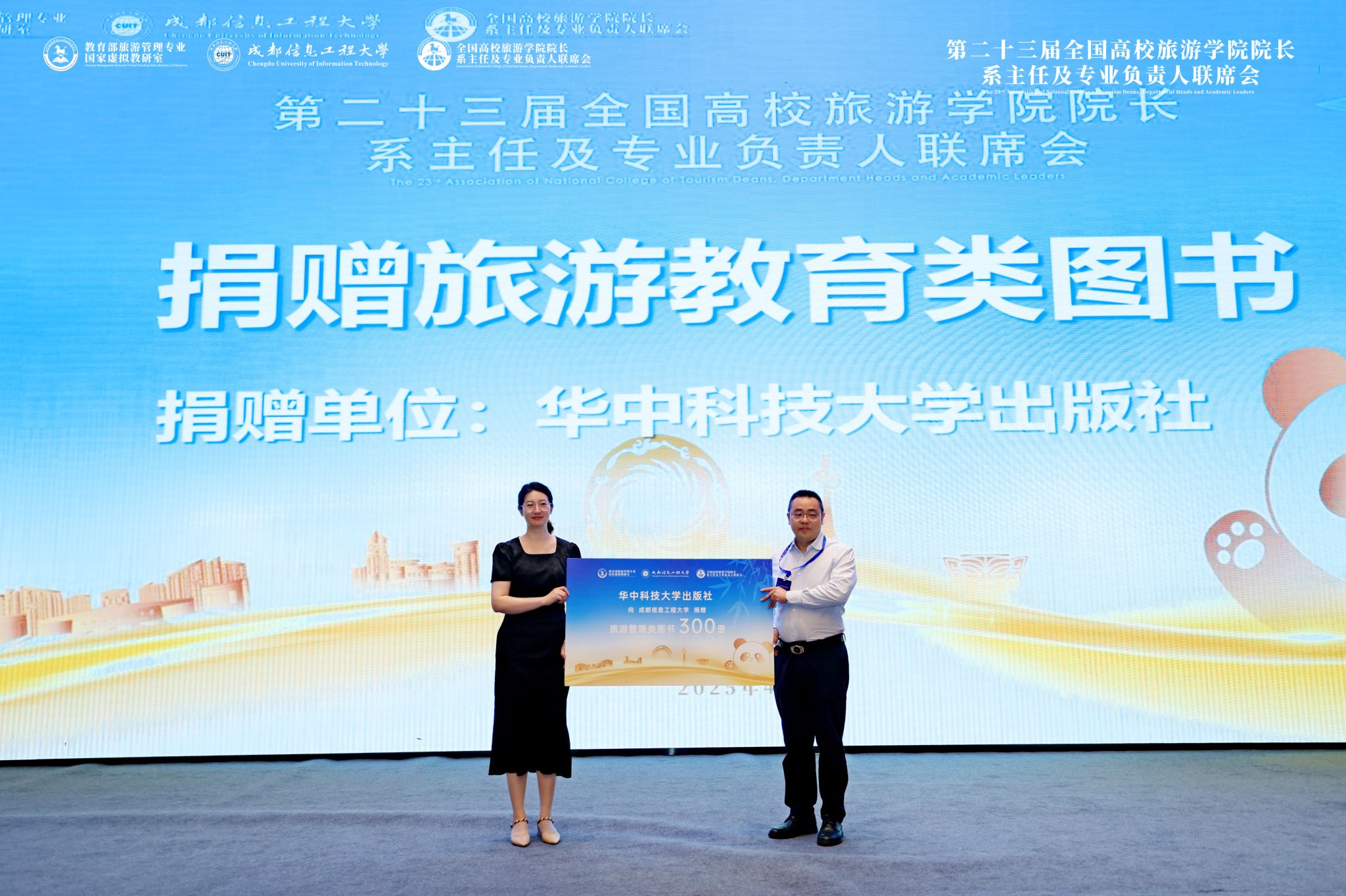 大会组委会为本次会议的主题演讲嘉宾、主持嘉宾、承办方云博体育管理学院、协办方代表华中科技大学出版社颁发了感谢状。同时,华中科技大学出版社旅游分社社长李欢向会议承办方捐赠旅游类图书300册,我校管理学院党委书记刘敦虎教授代表承办方接收捐赠。