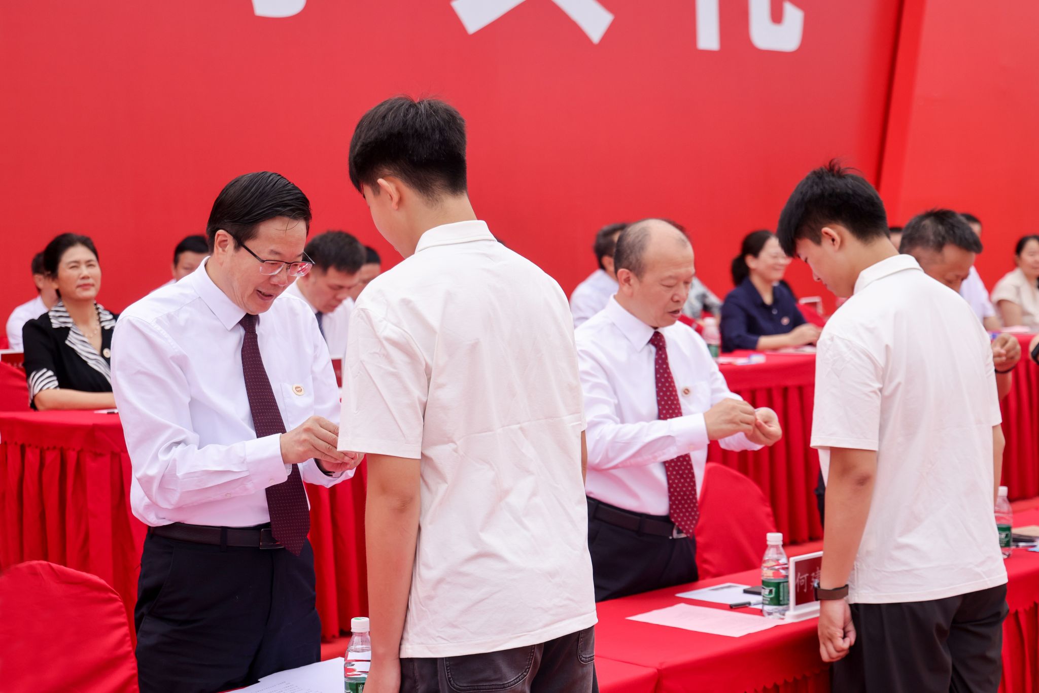 随后,主席台就座的领导和教师代表为新生代表佩戴云博体育校徽。这枚校徽不仅是“成信人”身份的象征,更是奉献青春力量,展现青年担当的使命传承。