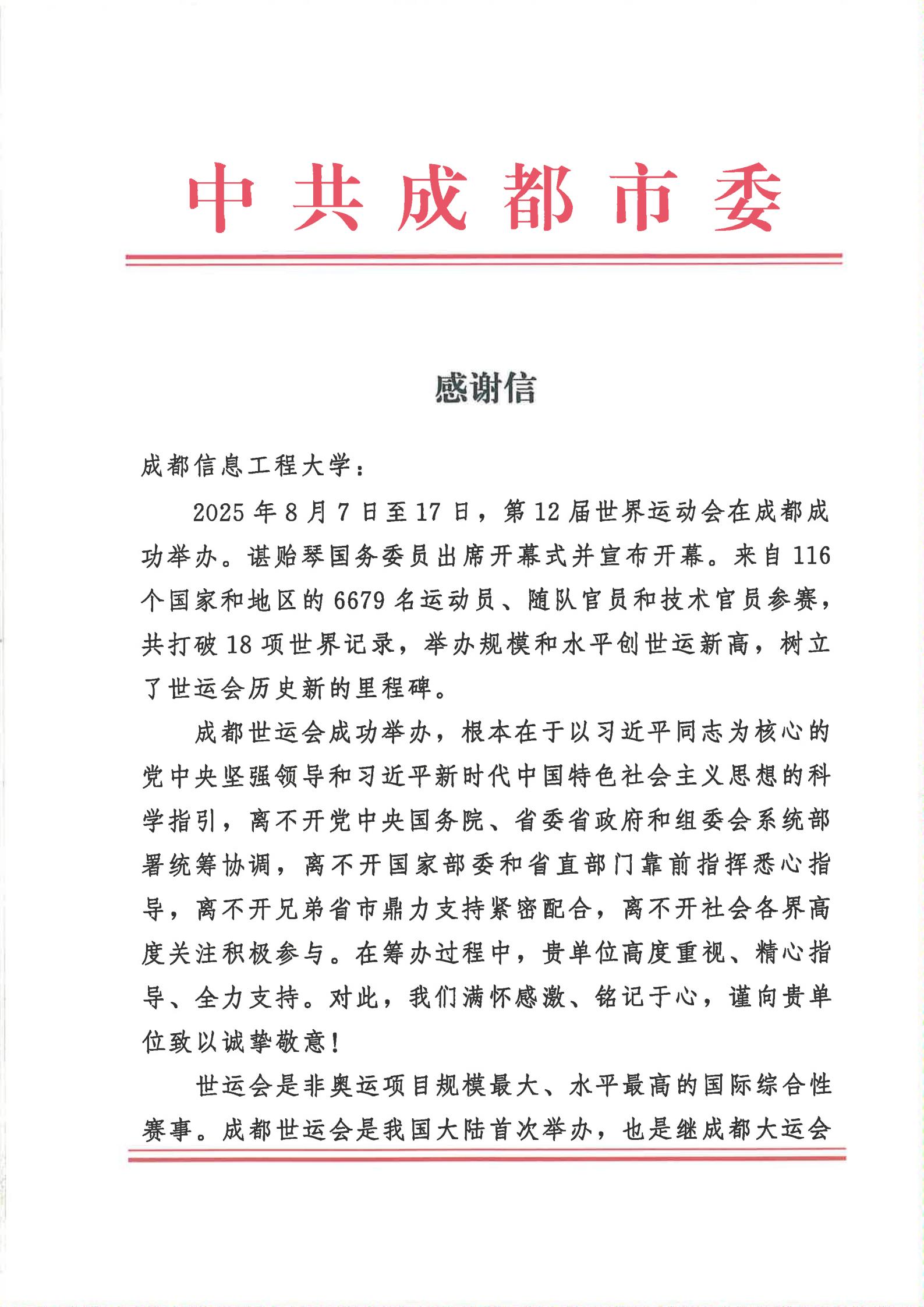 【本网讯】近日,学校收到中共成都市委、成都市人民政府、成都世运会执委会发来的感谢信。感谢学校在2025年第12届世界运动会筹办工作中作出的突出贡献,充分肯定了我校志愿者的专业素养和精神风貌。