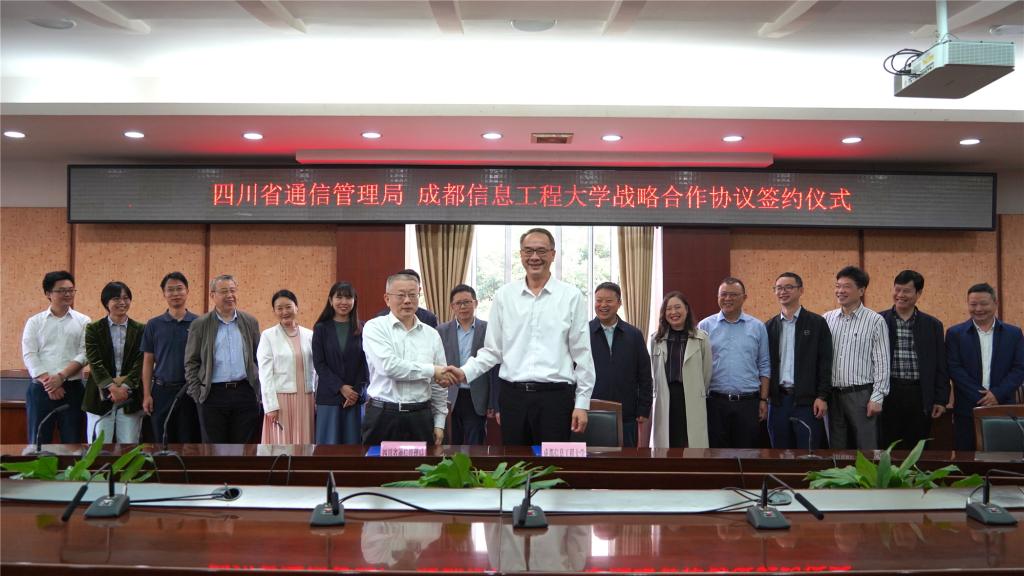 【本网讯】5月17日是世界电信和信息社会日。上午,四川省通信管理局党组书记、局长邢海英,党组成员、纪检组长、副局长刘小文一行来校交流,并与我校签署战略合作协议。学校校长余敏明、副校长舒红平参加了交流座谈会。会议由舒红平主持。
