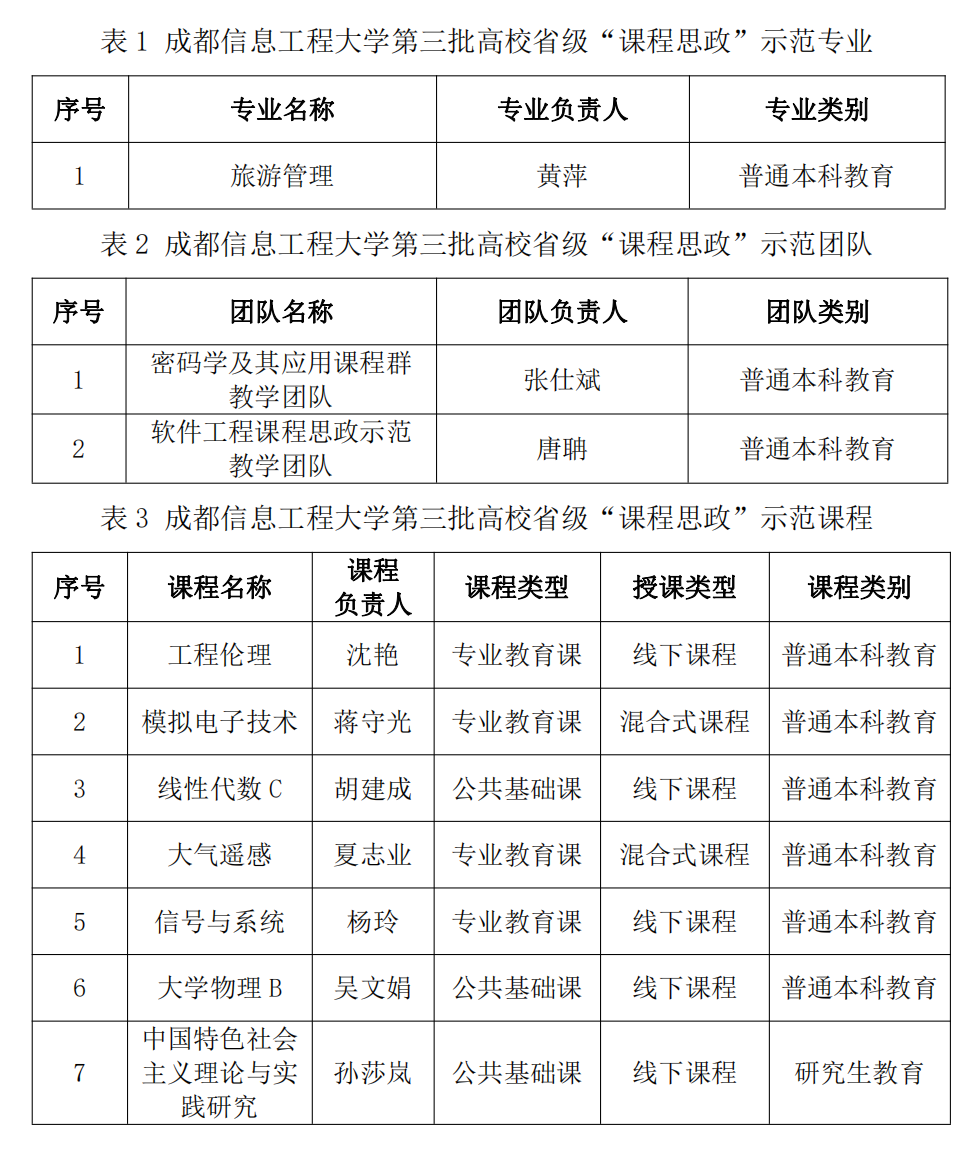我校旅游管理专业被认定为省级“课程思政”示范专业;密码学及其应用课程群教学团队、软件工程课程思政示范教学团队被认定为省级“课程思政”示范教学团队;《工程伦理》《模拟电子技术》《线性代数C》《大气遥感》《信号与系统》《大学物理B》《中国特色社会主义理论与实践研究》7门课程被认定为省级“课程思政”示范课程,其中《中国特色社会主义理论与实践研究》为研究生教育课程。详见下表。