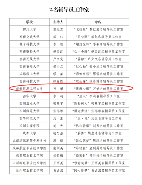 【本网讯】近日,中共四川省委教育工作委员会、四川省教育厅正式发文公布了高校思想政治教育名师工作室名单(2021-2025年第1批)。首批工作室共分为名思政课教师工作室、名辅导员工作室和心理健康教育名师工作室,其中20个辅导员名师工作室获批成功。