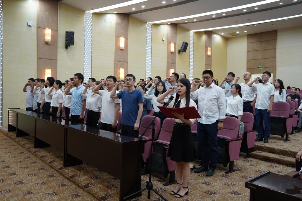 表彰大会现场,计算机学院廖雨静领誓,新进教师进行了师德宣誓:不忘立德树人初心,牢记为党育人使命,遵守教育法律法规,履行教书育人职责,引领学生健康成长。