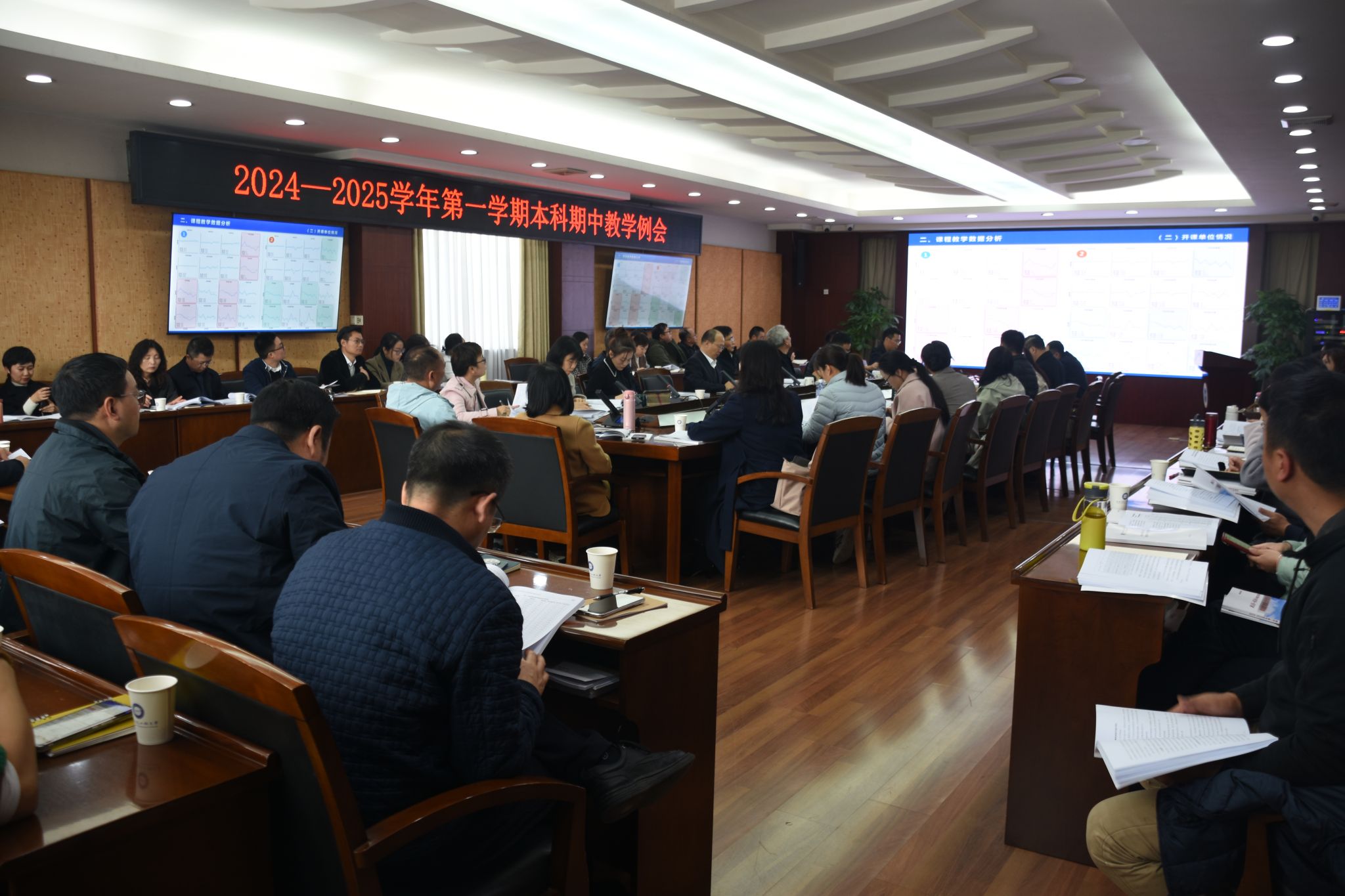 教学评估中心副主任胡晓飞解读了本学期课情与学情数据分析报告,报告以大数据可视化分析,对本学期教学进行了“全周期、全方位、全覆盖”的质量监测,分别从整体成绩变化、授课教师跟踪对比分析、小班化授课与评教情况、学生绩点等方面进行了说明,并展示了课情与学情数据分析详情。