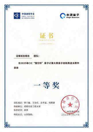 【本网讯】近日,由中国通信学会主办、中国通信学会量子计算专业委员会承办、本源量子计算科技(合肥)股份有限公司协办的第一届CIC“悟空杯”量子计算大赛圆满收官。学校网络空间安全学院(芯谷产业学院)先进密码与量子计算团队师生表现优异,荣获全国一等奖,两名研究生入选“优胜选手”并直通第39届全国青少年科技创新大赛。