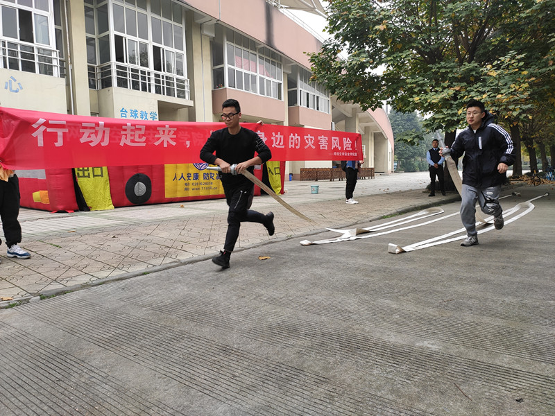 林细俤强调,疏散演练就是一次应对灾难的很好实践和体验,希望全院师生能牢固树立安全在于遵守制度,安全在于平时预防,安全在于自我保护,安全在于学习知识,安全更在于临危不惧的意识。吴教官为同学们宣传并讲解消防安全知识,并重点讲解“拉水带比赛”和“帐篷模拟逃生”活动流程及其注意事项。演练过程中最精彩部分为“帐篷模拟逃生”,消防帐篷内采取火灾烟雾模拟,真实还原火灾现场,演练师生需按逃生姿势,捂住口鼻,俯身前行,并在人体承受极限的45秒内完成逃生。参与演练的同学按照分组依次进入消防帐篷,采取计时逃生的方式,按照逃生姿势,均顺利完成逃生,这都考验着体验人员的火场逃生能力。同学们积极参与,切实增强了消防安全防范意识和火灾逃生自救能力。