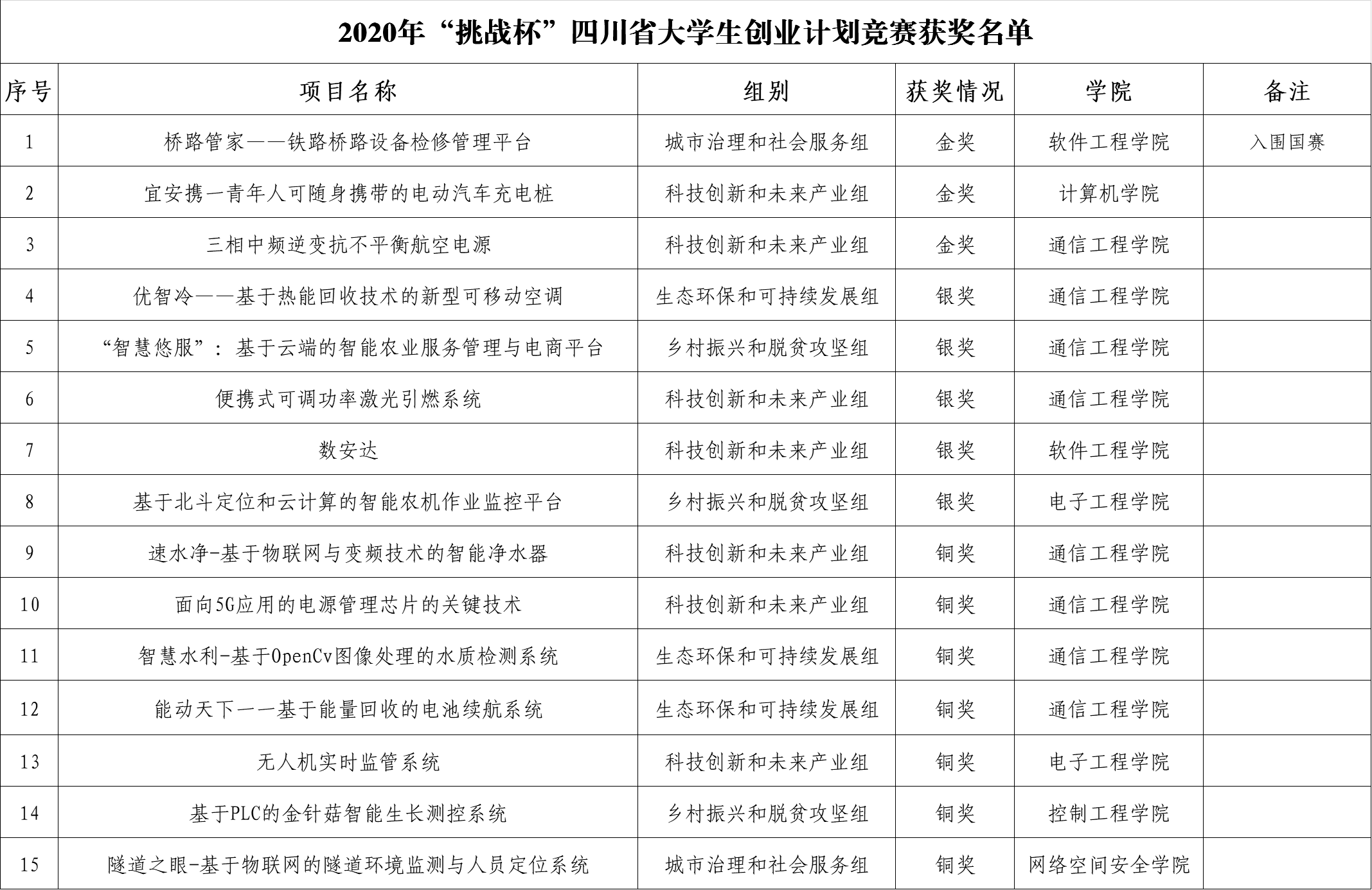 【本网讯】近日,由团省委、省委组织部、教育厅、省科协、省社科院、科技厅、人力资源与社会保障厅、省学联联合主办,四川轻化工大学承办的2020年“挑战杯”中国农业银行四川省大学生创业计划竞赛公布获奖名单。我校共获得金奖3项、银奖5项、铜奖7项,其中金奖项目,来自软件工程学院的《桥路管家——铁路桥路设备检修管理平台》获得评委一致青睐,被推报参加2020年“挑战杯”中国大学生创业计划竞赛全国决赛。