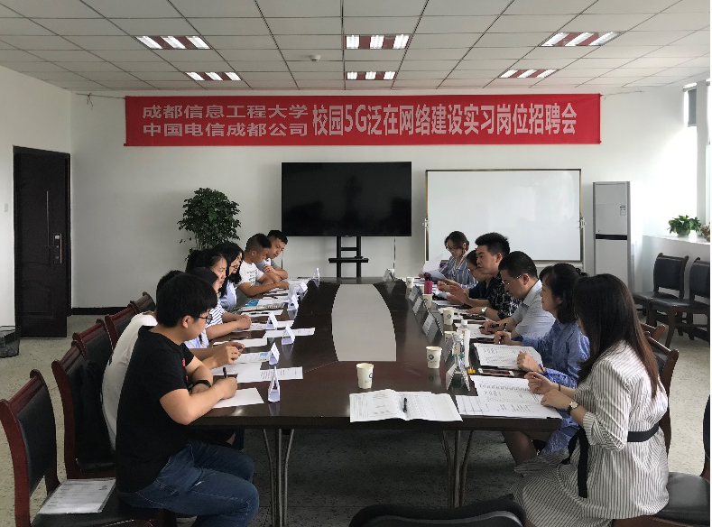 中国电信成都分公司在云博体育双中心A603举办了“校园5G泛在网络建设实习岗位招聘会”。中国电信成都分公司人力资源部、无线网络中心、双流分公司和云博体育通信学院老师共同组成面试工作组,对通信工程专业本科学生5G实习应聘者进行了面试选拔。最终,选拔了三年级学生10人、二年级学生7人共计17人进入校园5G网络建设实习岗位。