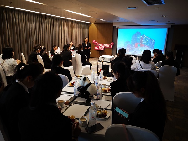 人力资源总监王刚和人力资源经理张娅兰与同学们进行面对面交流,为同学们介绍了万豪集团酒店品牌的概况,分享了自己在酒店行业中的成功经历以及从事酒店工作所必备的能力和素养,认真解答了每位同学的问题。