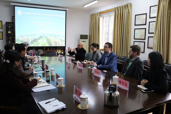 【本网讯】12月4日下午,美国西肯塔基大学中国项目部负责人David Kerr,美国明尼苏达大学 T. Ryan Hall博士,ESLI成都教学中心代表,四川宏图出国留学服务公司总经理宋泰村等一行五人到访我校管理学院,洽谈国际合作交流项目。管理学院党总支书记王子华,副院长李贵卿、孙艳玲,实证研究中心主任龚季兴等参加了交流座谈。