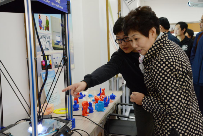 考察团先后参观了成创空间的路演大厅、二期和一期部分。工作人员向他们介绍了科创通以及3D打印机、数码平板打印机等开源设备。