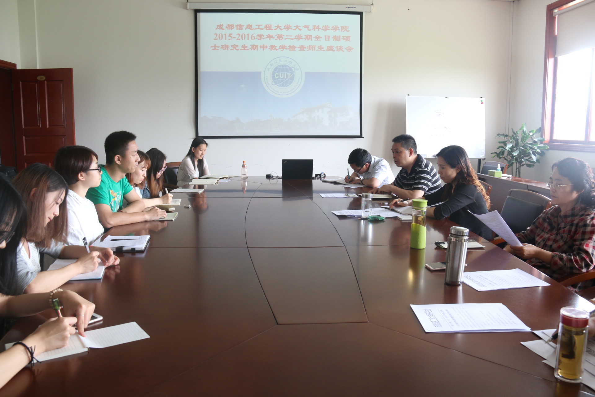 为全面了解研究生教学培养工作现状,规范和加强研究生教学培养与管理, 5月18日下午,大气科学学院在气象楼310室召开了2015-2016学年第二学期全日制硕士研究生期中教学检查师生座谈会。大气科学学院院长范广洲、党总支书记张小红、硕士生导师代表、研究生辅导员以及各年级研究生代表参加了会议。