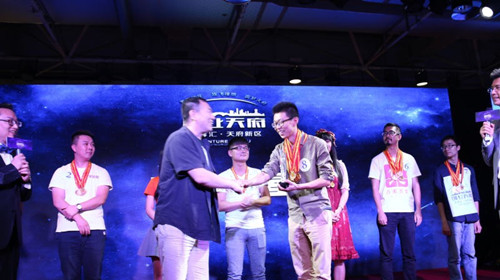 最后,来自成都的8号选手赵飞在“一分钟奇迹”中夺冠,获得“奇迹之星”称号,我校成都研究院院长、“成创空间”创始人宫冠英荣任“奇迹之星”的创业导师并为其颁奖。