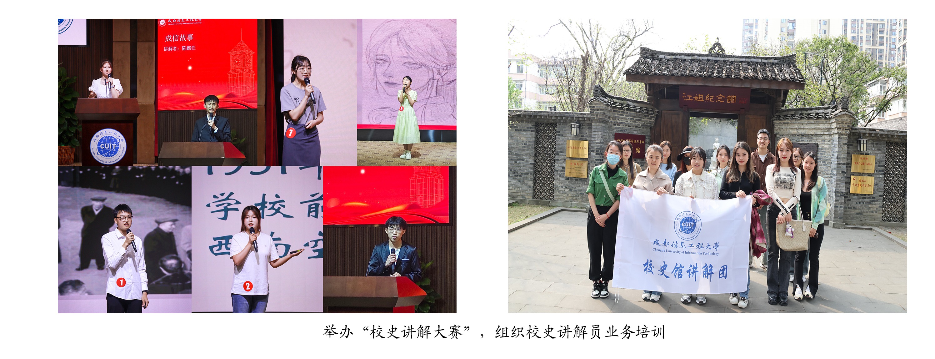 1.围绕中心,营造良好育人氛围。坚定文化自信,深刻挖掘运用“成信精神”内涵。围绕学校中心工作,通过学校官网主图、宣传橱窗海报、横幅、道旗、LED大屏、专题网站等多种形式,在校内营造良好的文化氛围。中华人民共和国成立75周年庆祝氛围营造,道路灯杆上安装180幅国旗;重大活动喷绘、横幅宣传50余次。