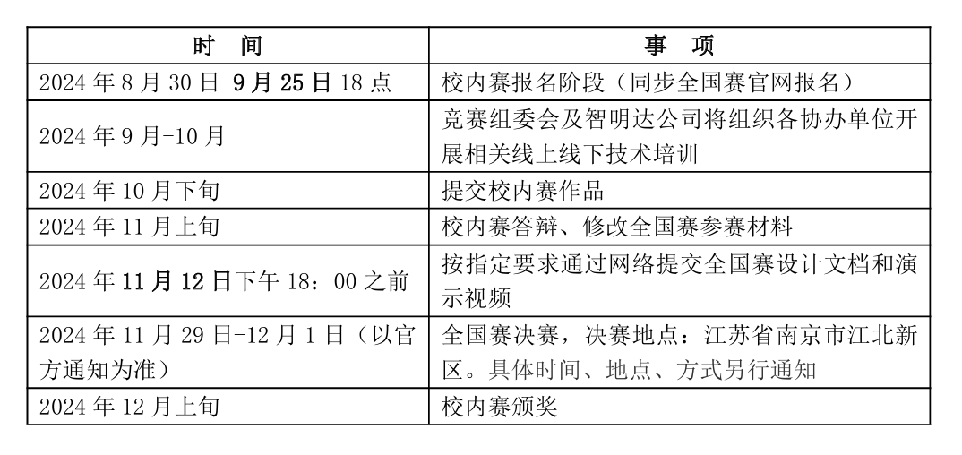 校内赛及全国赛报名截止时间:2024年9月25日18:00。注意除通过填写并提交在线报名表(https://jsj.top/f/ushKqo )以外,还务必于报名截止时间前通过竞赛网站(www.fpgachina.cn)完成报名工作,逾期截止。