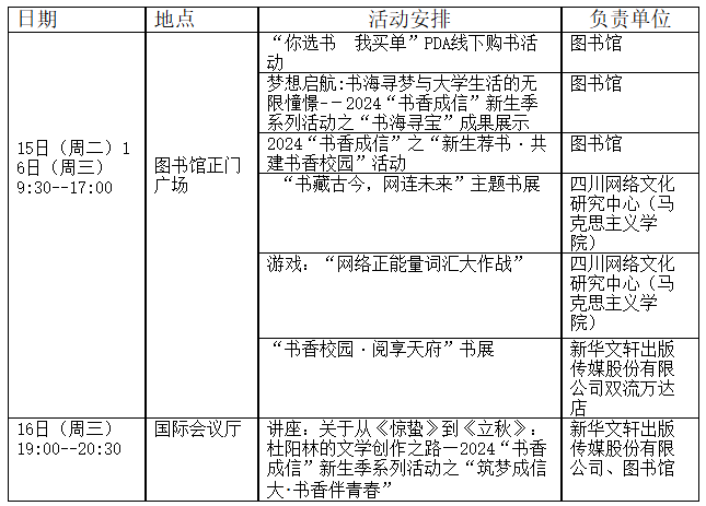 为进一步倡导全民阅读、终身学习的文明风尚,努力建设学习型社会,由四川省委宣传部指导、天府书展组委会主办的“天府书展进校园”活动将于10月15-16日在云博体育举行。学校图书馆在此背景下结合2024年度“书香成信”活动方案,设计了系列活动,期盼师生们在阅读中开阔视野,陶冶情操,提升文化素养。现将活动安排通知如下,欢迎广大师生积极参与!