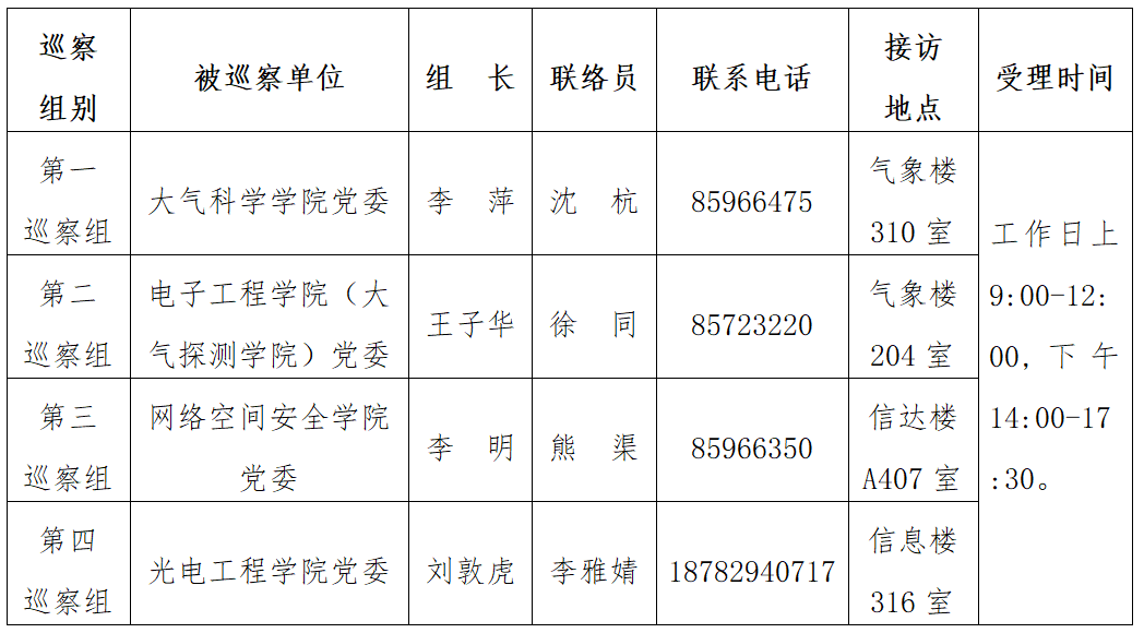 根据《中共云博体育委员会内部巡察工作实施意见》的规定,按照学校党委巡察工作领导小组的统一部署,学校党委巡察组将于2024年10月30日至11月30日,对大气科学学院党委、电子工程学院(大气探测学院)党委、网络空间安全学院党委、光电工程学院党委开展巡察工作。现将有关事宜公告如下: