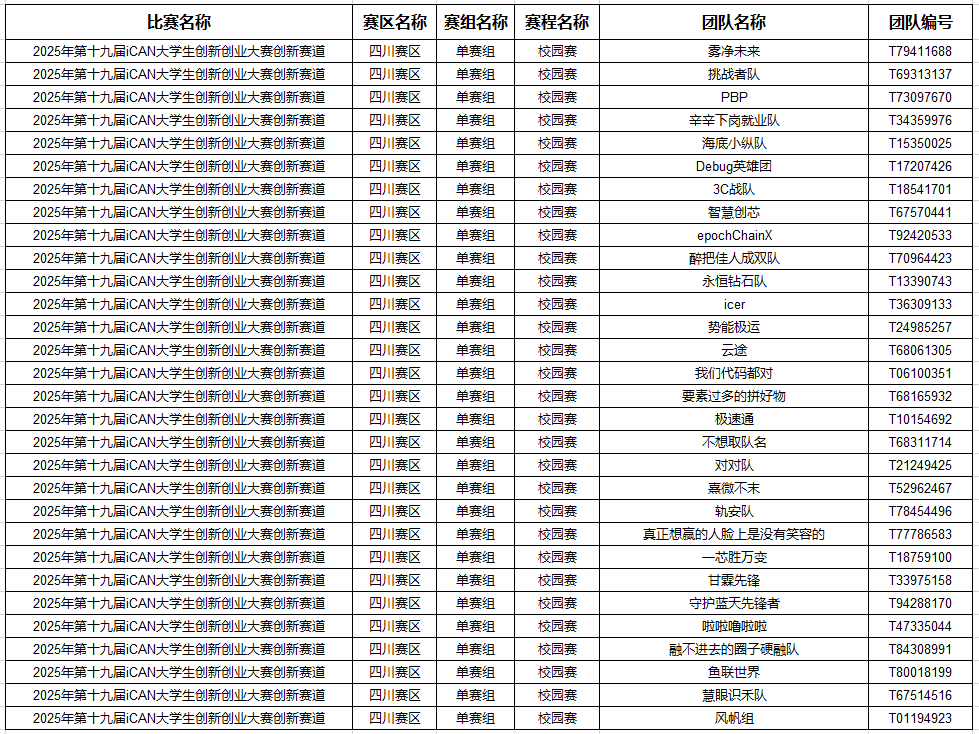 经过云博体育校内专家组根据各团队作品的创新性、商业性、技术方案以及文档的完备性进行综合评分,最终选拔出30支队伍参加第十九届iCAN大学生创新创业大赛西南区赛区线上选拔赛,入围团队名单见下表。