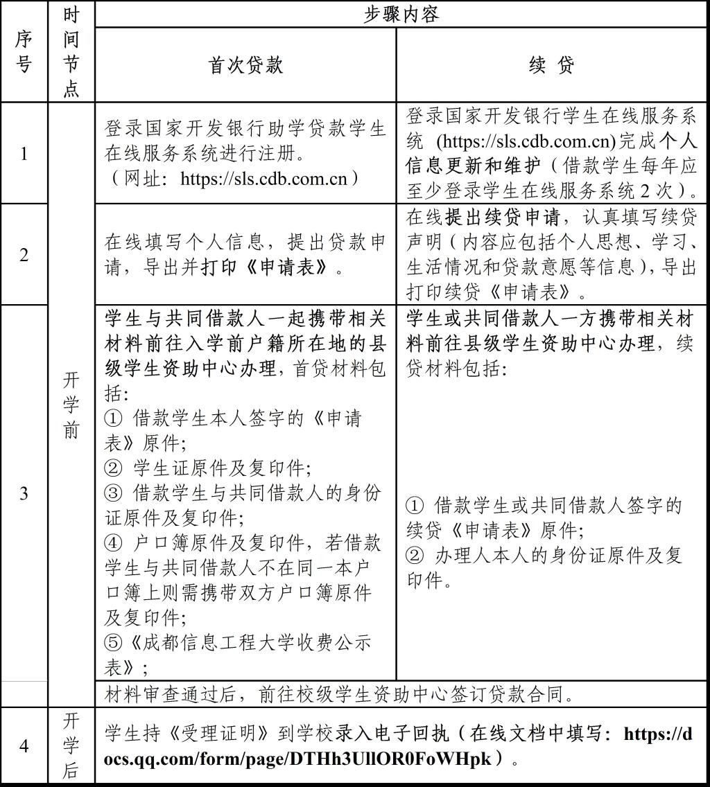 (四)为方便学生方便及时提交贷款回执信息,贷款机构为“国家开发银行”、“四川省农村信用社”的同学可以通过填写以下在线文档的形式提交相关回执信息,不必再提交纸质档。其他贷款机构的回执处理办法以贷款银行要求为准。