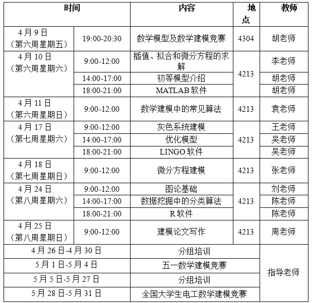 为了培养我校学生的创新意识及运用数学方法和计算机技术解决实际问题的能力,应用数学学院2021年继续组织和指导大学生数学建模竞赛系列活动,并从五一数学建模竞赛和全国大学生电工数学建模竞赛的获奖队伍中选拔2021年全国大学生数学建模竞赛的参赛队伍。为了参赛同学能在选拔赛中取得优异成绩,应用数学学院数学建模指导组从第六周开始,分别从数学建模基础、数学建模算法、数学建模案例分析以及常用数学软件等方面进行培训,欢迎对数学建模及数学建模竞赛感兴趣的同学积极参加培训,培训安排见表1。