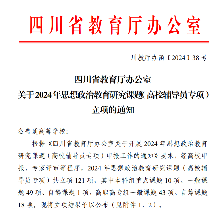 【本网讯】近日,四川省教育厅公布了2024年思想政治教育研究课题(高校辅导员专项)的立项结果。我校辅导员万娟主持的课题《新时代背景下基于幸福理论的高校大学生积极心理品质提升研究》成功入选省教育厅2024年思想政治教育研究课题立项名单。