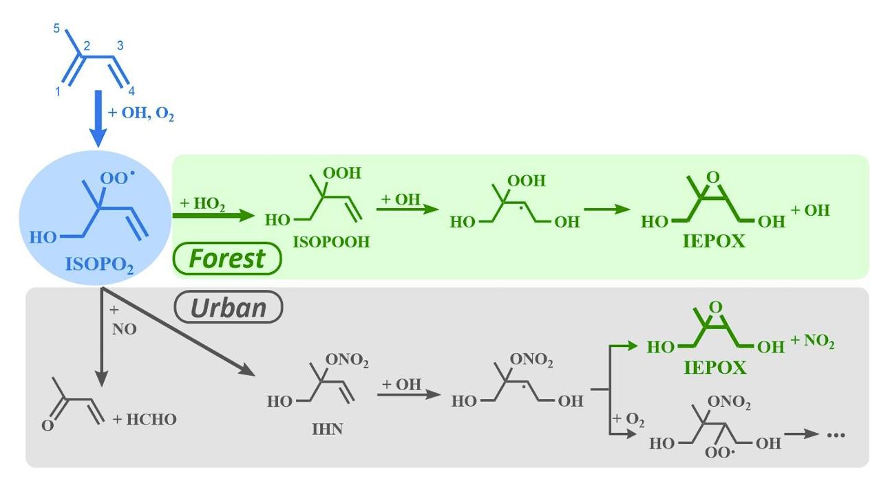 图1. 异戊二烯在森林和城市地区通过不同的大气氧化过程形成IEPOX