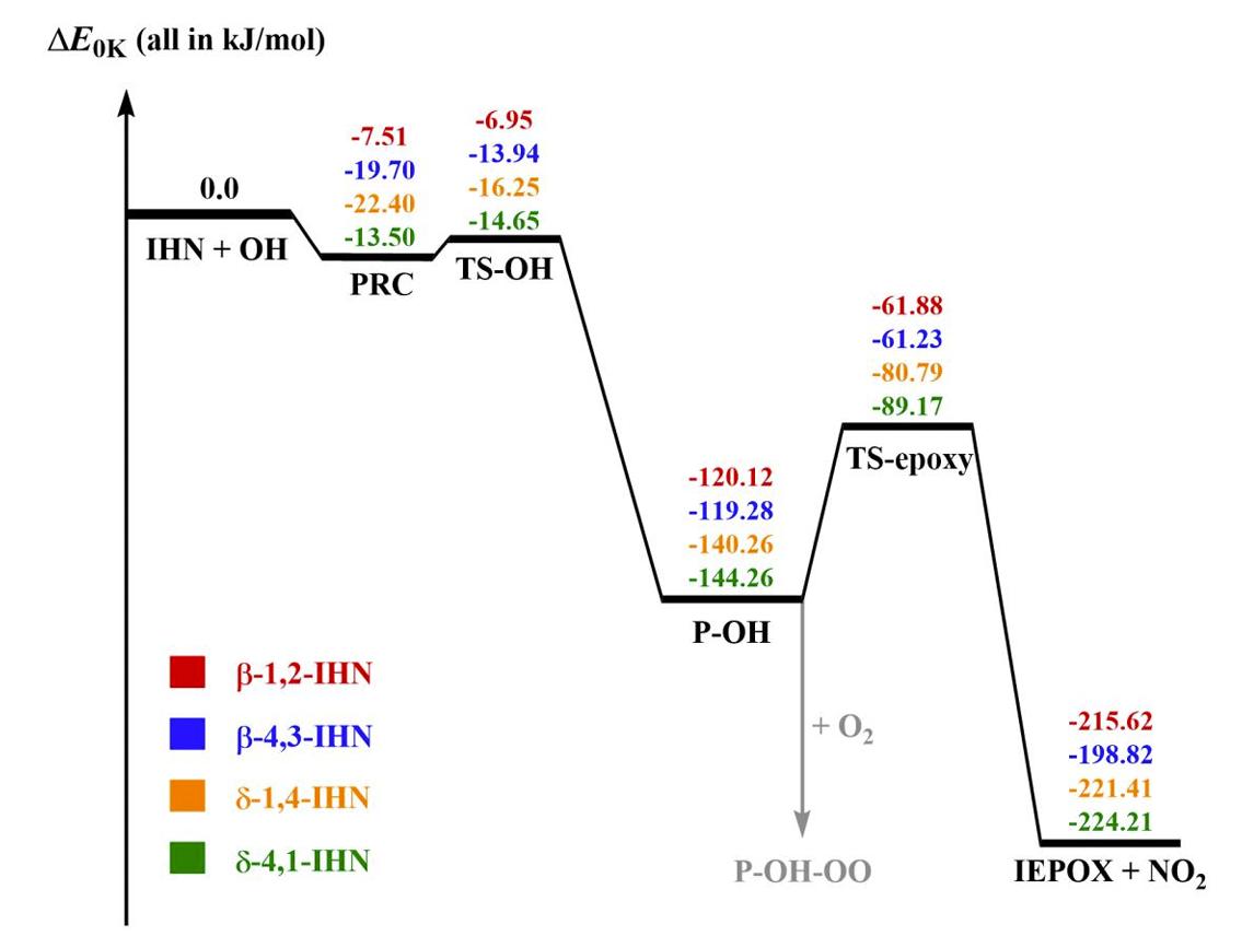 图2. 异戊二烯有机硝酸酯与OH自由基反应形成IEPOX的化学反应势能面