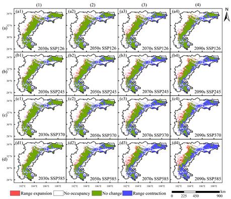 图1未来气候情景下大熊猫的潜在适生区范围变化情况,其中(a)、(b)、(c)和(d)代表SSP126、SSP245、SSP370和SSP585气候情景,(1)、(2)、(3)和(4)代表2030s、2050s、2070s、2090s