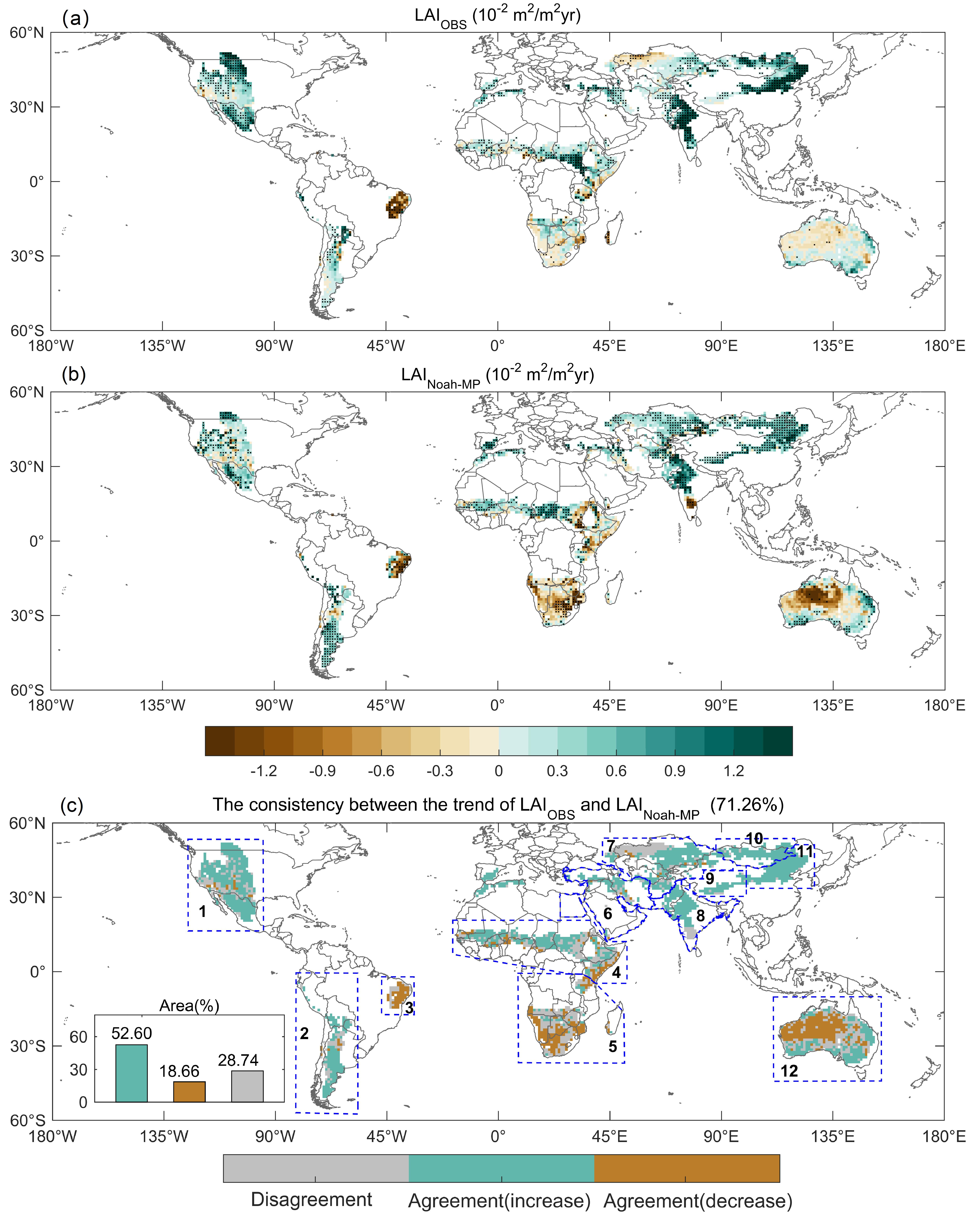 图1卫星观测和Noah-MP模式模拟的LAI变化趋势及其一致性