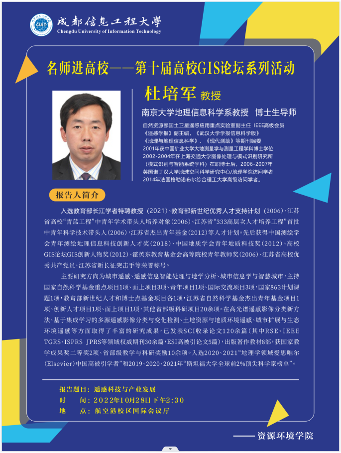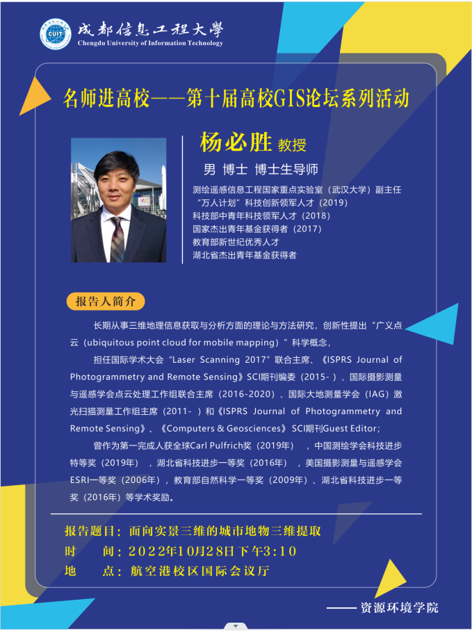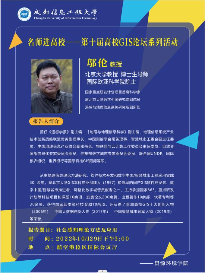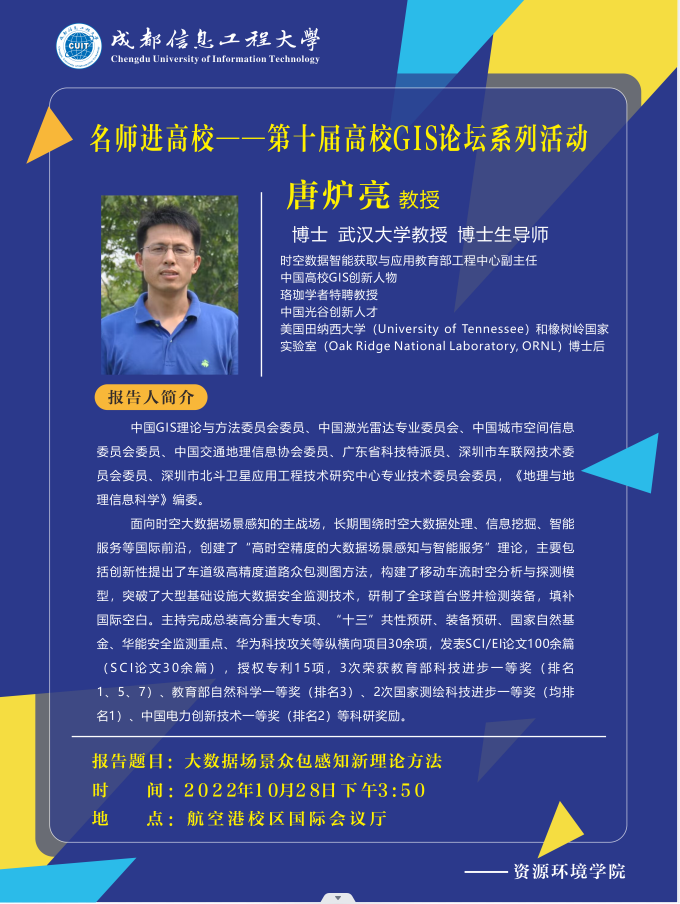 【本网讯】作为第十届高校GIS论坛系列活动之一,“名师进校园——云博体育站”于2022年10月28日至29日在云博体育航空港校区国际会议厅成功举行。此次学术活动由资源环境学院承办,科技处、研究生处给予了大力支持。活动由资源环境学院院长徐成华教授主持,来自北京大学邬伦教授、南京大学杜培军教授、武汉大学杨必胜教授和唐炉亮教授、深圳大学涂伟副教授多位名师走进我校,为地理信息科学、遥感科学与技术、测绘工程等专业的两百余名在读大学生和研究生奉献了一场有关地理信息科学、遥感、现代测绘的学术盛宴。