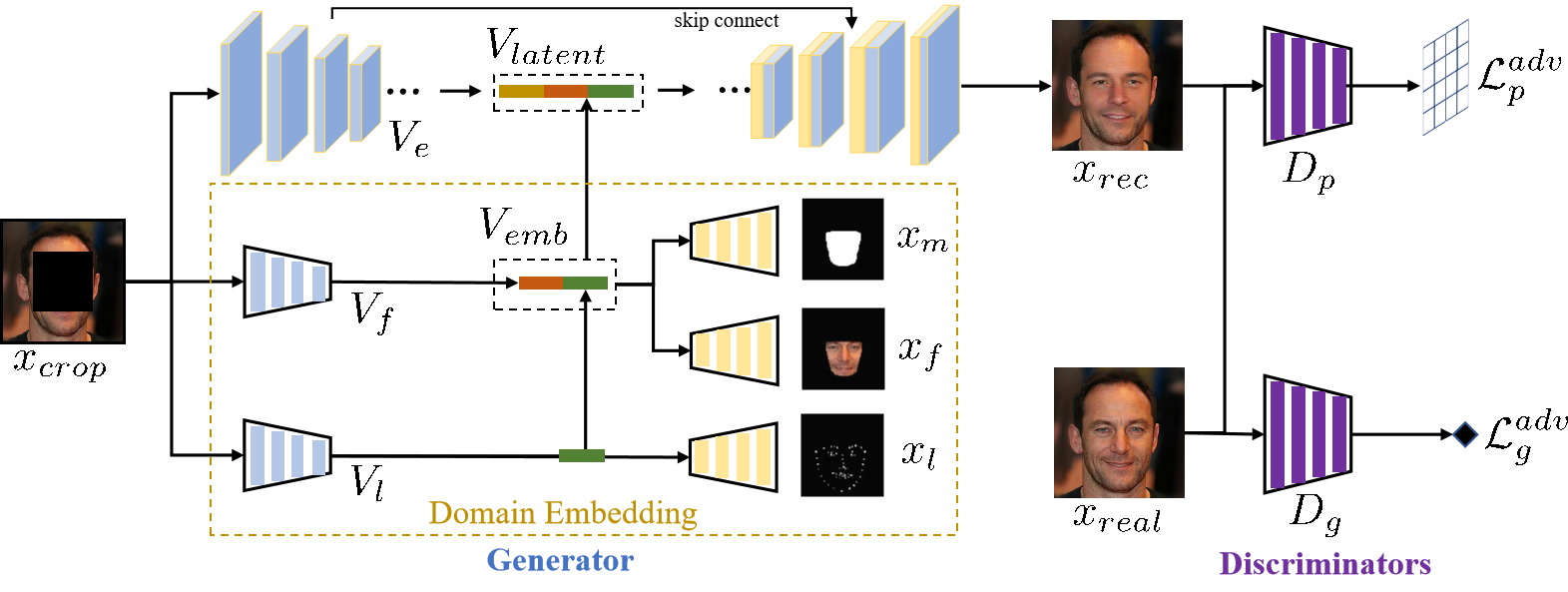 文章信息:Xian Zhang*, Xin Wang*, Canghong Shi, Zhe Yan, Xiaojie Li**, Bin Kong, Siwei Lyu, Bin Zhu, Jiancheng Lv, Youbing Yin, Qi Song, Xi Wu**, Imran Mumtaz. DE-GAN: Domain Embedded GAN for High Quality Face Image Inpainting[J]. Pattern Recognition, 2021: 108415.