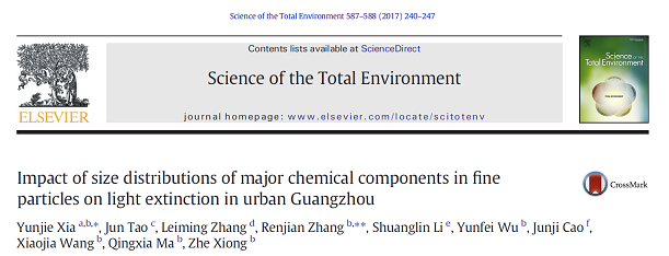 【本网讯】近日,大气科学学院研究生夏芸洁以第一作者身份,在国际知名期刊《Science of the Total Environment》上发表了名为“Impact of size distributions of major chemical components in fine particles on light extinction in urbanGuangzhou”的学术论文。中国科学院大气物理研究所研究员张仁健、研究员李双林为共同导师及通讯作者,云博体育为第一署名单位。