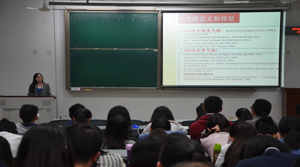 胡淼老师作了题为《冬春季北极涛动与西北太平洋热带地区降水的联系》的报告。她通过分析其统计特征,解释了北极涛动与热带气候的联系。三位研究生就目前所取得的学术成果给大家进行了交流,报告题目分别是:《绵阳城区冬季典型污染过程的个例分析》,由杜筱筱主讲;《四川典型区域滑坡泥石流与降水的关系》,由刘海知主讲;《一次西南低涡引发广西强降水的湿位涡和二阶湿位涡特征》,由韦晶晶主讲。精彩的报告获得了在座师生的阵阵掌声,报告结束以后,四位主讲与在座师生进行了深入的交流,引发了一系列学术讨论,现场气氛热烈。
