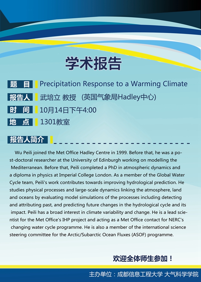 来源:大气科学学院 作者:曹露日期:2016-10-12 审核:新闻中心 点击: