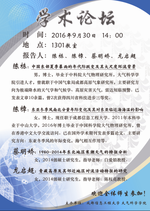 来源:大气科学学院 作者:胡培日期:2016-09-29 审核:新闻中心 点击: