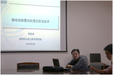 【本网讯】4月15日下午,国家电网四川省电力科学研究院设备状态评价中心副主任范松海博士应邀来我院,作题为《输电线路覆冰机理及防治技术》的学术讲座,大气科学学院多位老师及研究生前往参加。该讲座由大气科学学院副院长陈权亮主持。