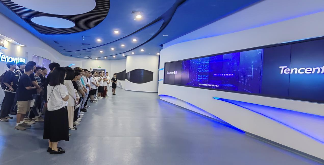 在参观环节,同学们通过讲解员介绍和观看腾讯项目宣传短片感受到了企业的发展规模和历程,了解了腾讯公司的业务范畴、发展历史和成为行业领军者的挑战。