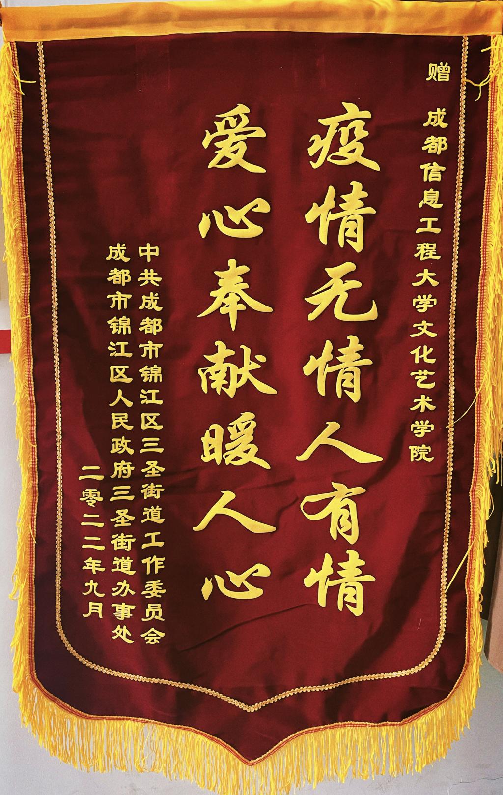 10月18日下午,云博体育文化艺术学院、民主建国会云博体育支部分别收到了锦江区人民政府三圣街道办事处送来的两面“疫情无情人有情,爱心奉献暖人心”锦旗,表达对学院、支部在成都“8.25”疫情爆发之时给予的帮助与支持表示谢意。