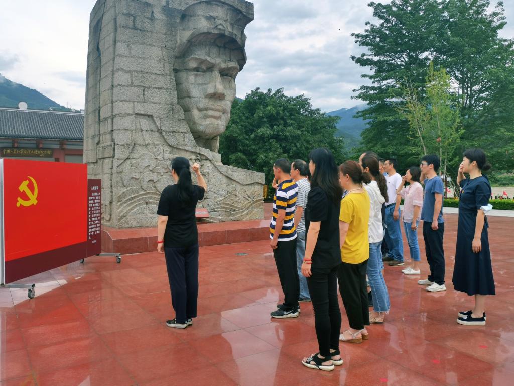 参观结束后,图书馆直属党支部全体党员步行至纪念馆门前的宣誓牌前,集体重温入党誓词,大家面向鲜红的中国共产党党旗,郑重举起右拳,庄严的宣誓声回响在广场上。